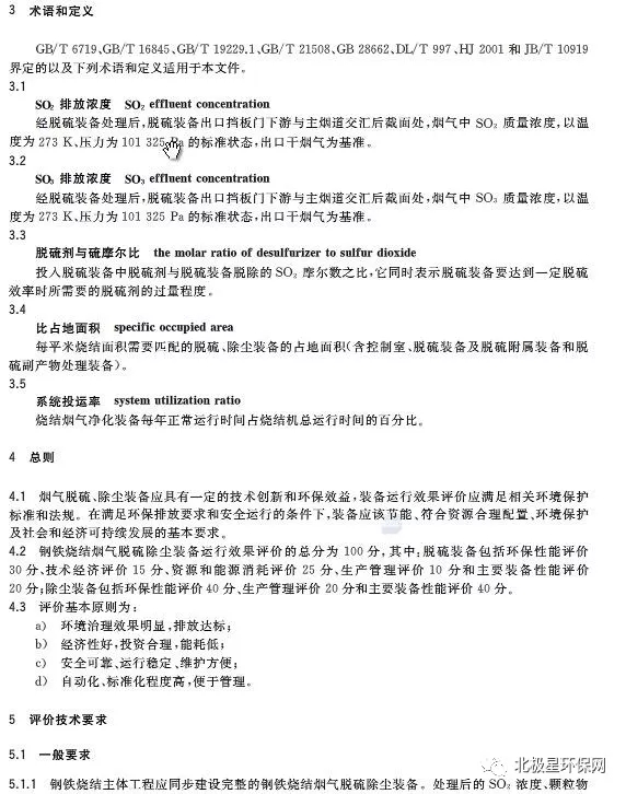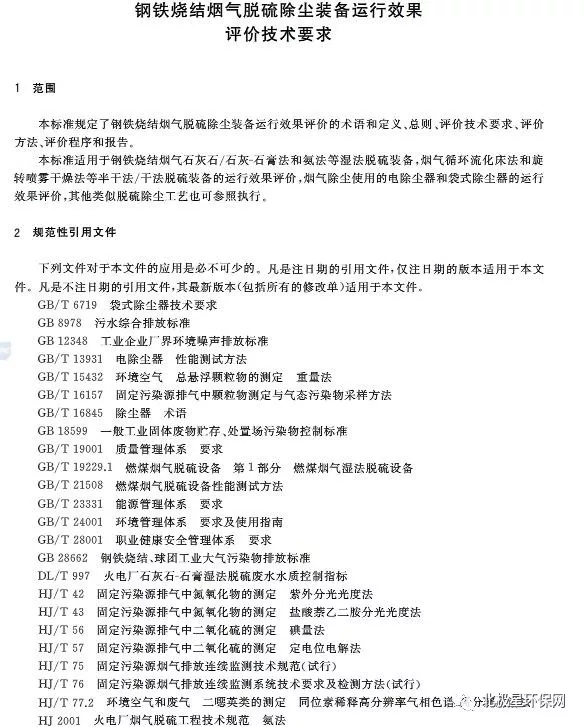 該《標(biāo)準(zhǔn)》適用于鋼鐵燒結(jié)煙氣石灰石/石灰-石膏法和氨法等式濕法脫硫裝備,煙氣循環(huán)流化床法和旋轉(zhuǎn)噴霧干燥法等半干法/干法脫硫裝備的運行效果評價,煙氣除塵使用的電除塵和袋式除塵器的運行效果評價,其他類似脫硫除塵工藝也可參照執(zhí)行。