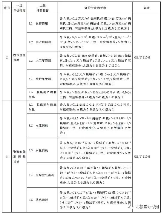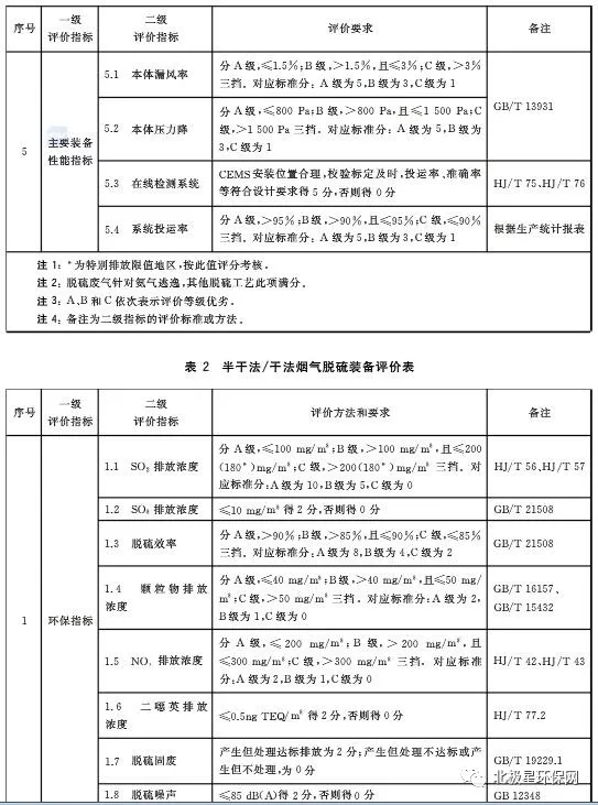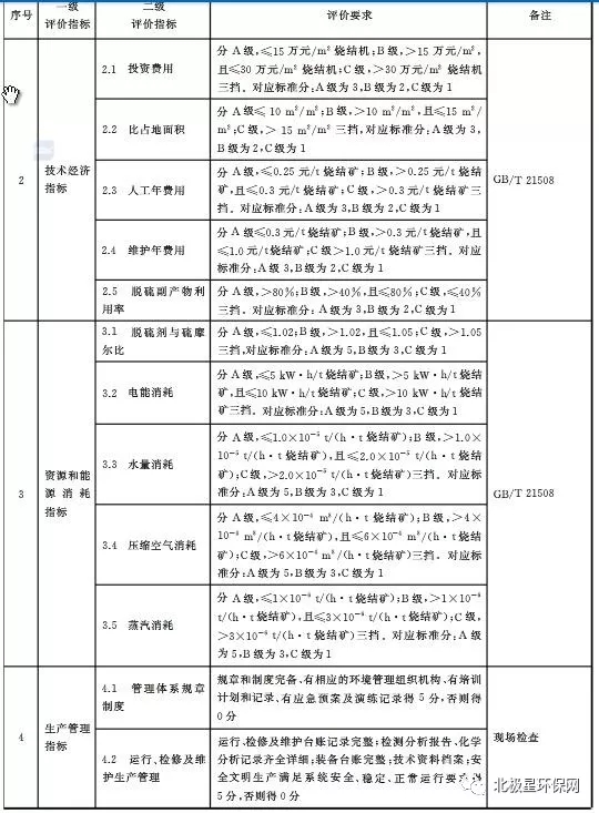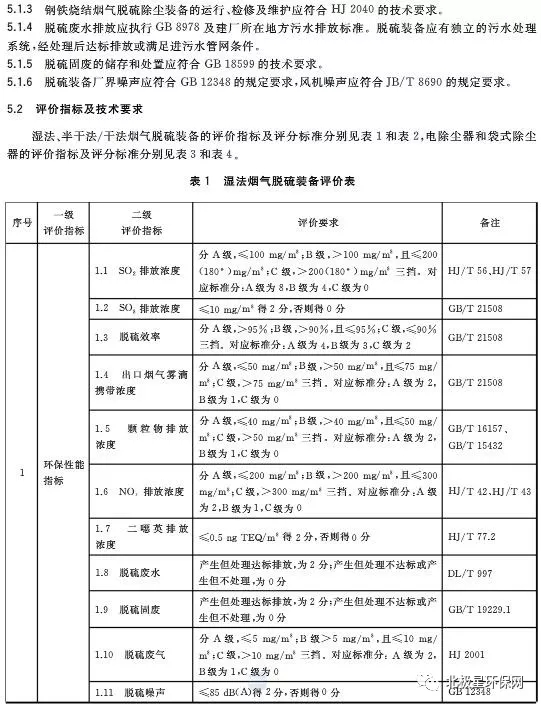 日前,中華人民共和國國家質(zhì)量監(jiān)督檢驗檢疫總局、中國國家標(biāo)準(zhǔn)化管理委員會發(fā)布《鋼鐵燒結(jié)煙氣脫硫除塵裝備運行效果評價技術(shù)要求GB/T 34607-2017  》。根據(jù)標(biāo)準(zhǔn)要求,鋼鐵燒結(jié)煙氣脫硫除塵裝備運行效果評價總分為100分,其中:脫硫裝備包括環(huán)保性能評價30分,技術(shù)經(jīng)濟評價15分,資源和能源消耗評價25分、生產(chǎn)管理評價10分和主要裝備性能評價20分;除塵裝備包括環(huán)保性能評價40分,生產(chǎn)管理評價20分和主要裝備性能評價40分。濕法脫硫性能指標(biāo)包括SO2排放濃度、SO3排放濃度、脫硫效率、霧滴濃度、顆粒物排放濃度、NOx濃度、二惡英濃度等,詳見表1。半干法/干法脫硫性能指標(biāo)包括SO2排放濃度、SO3排放濃度、脫硫效率、顆粒物排放濃度、NOx濃度、二惡英濃度等,詳見表2。電除塵、袋除塵主要性能指標(biāo)包括顆粒物濃度、去除率、本體漏風(fēng)率、壓力降等,詳見表3、4。